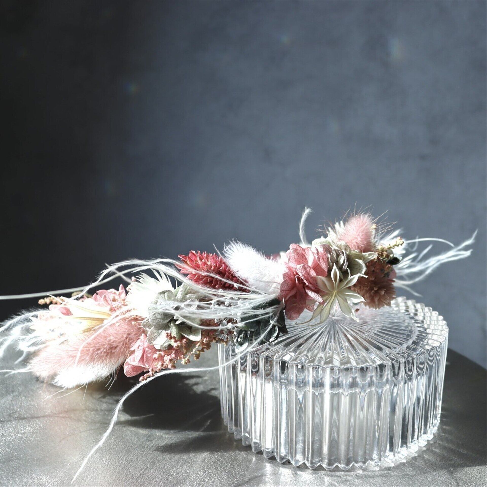 繊細なプリザーブドフラワーを丁寧にあしらい、小さなお子様の愛らしさを引き立てるデザインに仕上げさせていただきます。